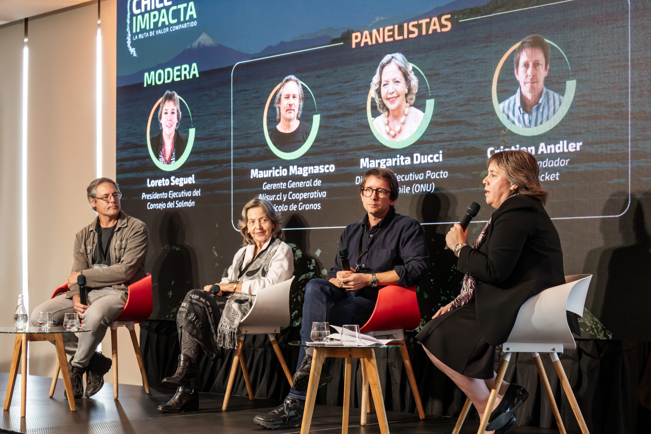 El ciclo de summits “Chile Impacta | La ruta de valor compartido” consolidó su primer encuentro en Puerto Varas con una nutrida agenda, que incluyó presentación de speakers, cuatro paneles de conversación y espacios para networking. El tercer panel de la jornada presentó el tema “La nueva cadena de valor: proveedores para una industria baja en carbono”, espacio que fue moderado por Loreto Seguel, presidenta ejecutiva del Consejo del Salmón, y que contó con la participación de Margarita Ducci, directora ejecutiva de Pacto Global Chile; Mauricio Magnasco, gerente general de la Cooperativa Agrícola de Granos, y Cristian Andler, socio fundador de Greenticket.